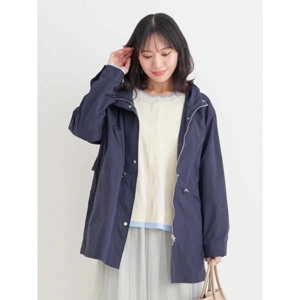 ・首元をカバーする高めのネックとフードで大人カジュアルな印象に。