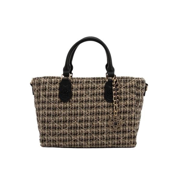 秋冬らしいあたたかみのあるツイード素材に、キルティング加工を施して上品な立体感を演出した「フラシオン」シリーズ。華やかさと落ち着きを両立させたデザインは、日常のコーディネートに気品を添えてくれる存在です。2way仕様のショルダー・手持ちの両スタイルを使い分けできる実用性も魅力。バイカラーのチェーンとカメリアチャームがデザインのアクセントとなり、シンプルながらも目を引く仕上がりに。使いやすいカラーとサイズ感で、通勤やお出かけ、季節感のあるスタイリングに幅広く活躍します。・A4対応(22×31cm):×・長財布(10×20cm):〇・ペットボトル横向き(500ml):〇・ペットボトル縦向き(500ml):〇【メーカーサイズ寸法(実寸)】FREE : 重さ:640g, 高さ:21cm, 幅:28-36cm, 底マチ:13cm, 持ち手高さ:12cm, ショルダーストラップの長さ:94-121cm