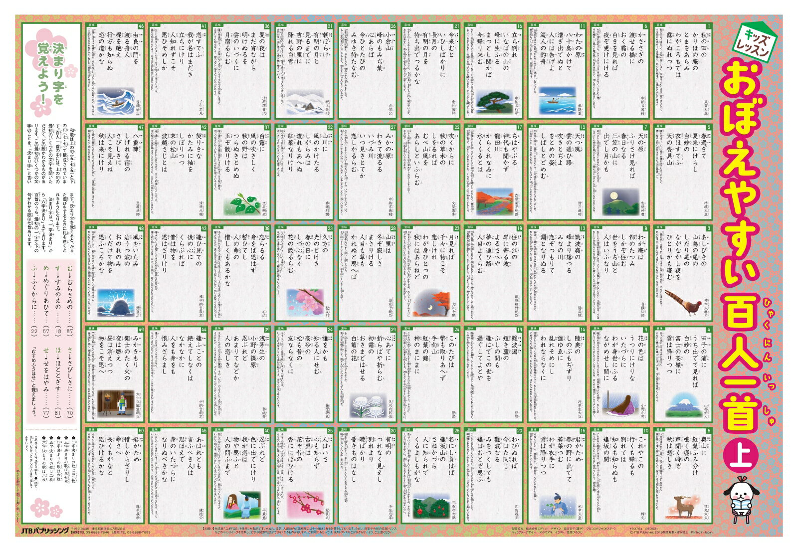 ★小学校低学年から覚えたい百人一首をポスター2枚にまとめました!水をつけるとお風呂の壁に貼れる、「ユポFGS」紙を使用したポスタータイプの教材です。★デザインや向きをリニューアル!ポスターが縦長から横長に、札のデザインや文字の大きさも改良し、より見やすくなりました。★日本の文化や伝統に興味を持つきっかけに!お部屋はもちろん、お風呂でも、トイレでも。子どもの目に付く場所に貼って、普段から百人一首に触れることができます。★イラスト入りで覚えやすい!目で見て和歌の意味が理解できるよう、和歌を表現したイラスト入りで、視覚的に理解できます。★決まり字や遊び方も合わせてご紹介。坊主めくり、源平合戦といった百人一首かるたの遊び方、遊ぶ時に役立つ決まり字も一緒に学ぶことで、楽しく百人一首に親しめます。