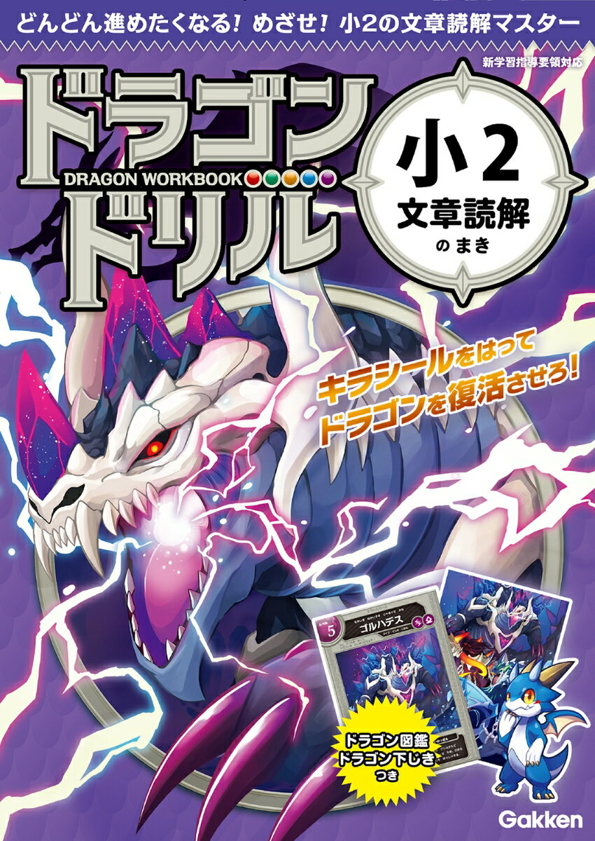 【カッコいいドリルで勉強したい!】ドラゴンが封印された小学ドリルシリーズの続編が登場!勉強がニガテでも、これならどんどん進められる!★勉強するとドラゴン復活!でっかいキラシールを貼るとドラゴンのイラストが完成。・1回分の勉強を終えるたびにシールを貼っていくと、最大15cm四方のドラゴンのイラストが完成。・ドラゴンは全て、ゲーム業界で活躍するイラストレーターによる描き下ろし。教材の域を超えたクオリティを実現!・解けば解くほどレベルの高いドラゴンがゲットできるので、どんどん進めたくなり、自然と学習習慣がつく。★まるで魔法書!想像力を刺激する学習ページで、楽しく勉強できる。・全ページ、魔法書やダンジョンをモチーフにしたデザインで、めくるだけでワクワクする!・もちろん学習内容も充実。スモールステップで進むので、ニガテな子も安心。1冊で1年分の文章読解マスターになれる。★他にも、楽しい要素が満載! 【ドラゴンずかん】身長・体重、生息地、能力パラメータ、必殺技など、ゲームさながらのデータが満載。【ドラゴンの種族】各巻には、火属性や水属性などの異なる種族のドラゴンを収録。集めて楽しいラインナップに。【ドラゴン下じき】ドラゴンのイラストを大きくあしらった下じきが付録。【目次】ライオンの かりサバンナに いる きけん生ぶつカエルの どくに 気をつけろゾウの 耳の ひみつカメレオンの 目の ひみつドラゴンの バトル1きょうりゅうの か石の でき方体の 長い ディプロドクスいちばん 大きい きょうりゅうは?ホッキョクグマの 体の 色どくヘビの 体の 色ドラゴンの かりアイテムを さがせ!サソリの どくばりに 気をつけろ森に すむ きけんな 鳥コウテイペンギンの たまごライオンの 子そだてガゼルの 赤ちゃんドラゴンの むれ太ようけいに ある わく星金星って どんな わく星?火星って どんな わく星?木星って どんな わく星?土星って どんな わく星?大きな うちゅううちゅうの でき方イルカの おしゃべりうつくしい ドラゴンドラゴンが まもる ほう石おそろしい 人食いザメもうどくを もった タコカバの 体当たりアルマジロの ぼうぎょゆうかんな ラーテルきょうりゅうどうしの たたかいおよげる きょうりゅういちばん あしの はやい きょうりゅうドラゴンの バトル2【全38回】