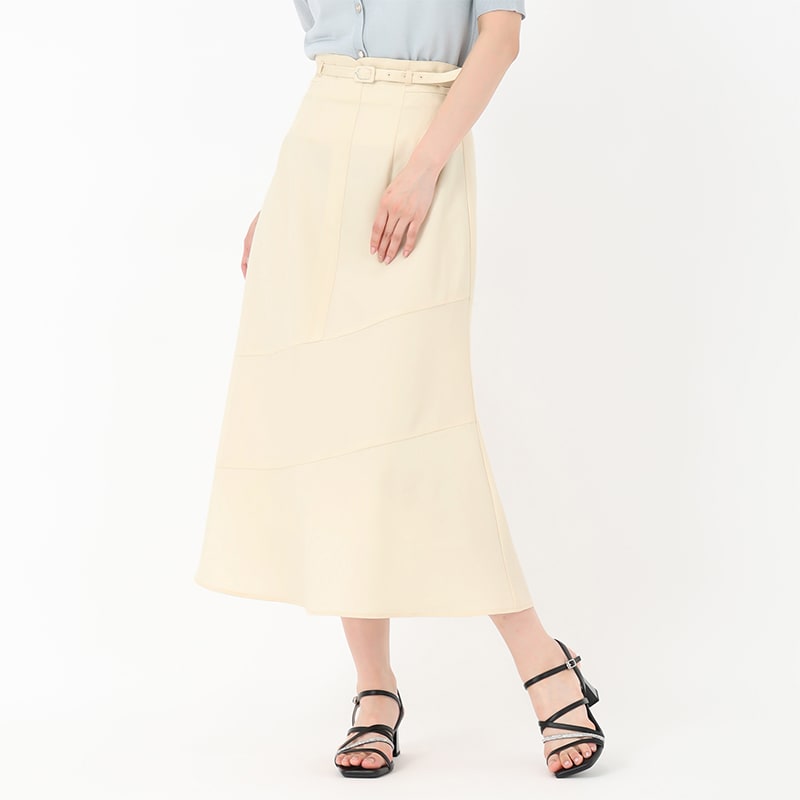 アシンメトリーな切り替えデザインが魅力的なスカート。なだらかに広がるAラインのシルエットになっており、フェミニンな印象を与えます。バックのウエストゴム仕様がポイント。ベルト付きなので、トップスをタックインした着こなしもおすすめです。■fabric透け感[無し]裏地[無し]伸縮性[やや有り]生地の厚さ[普通]