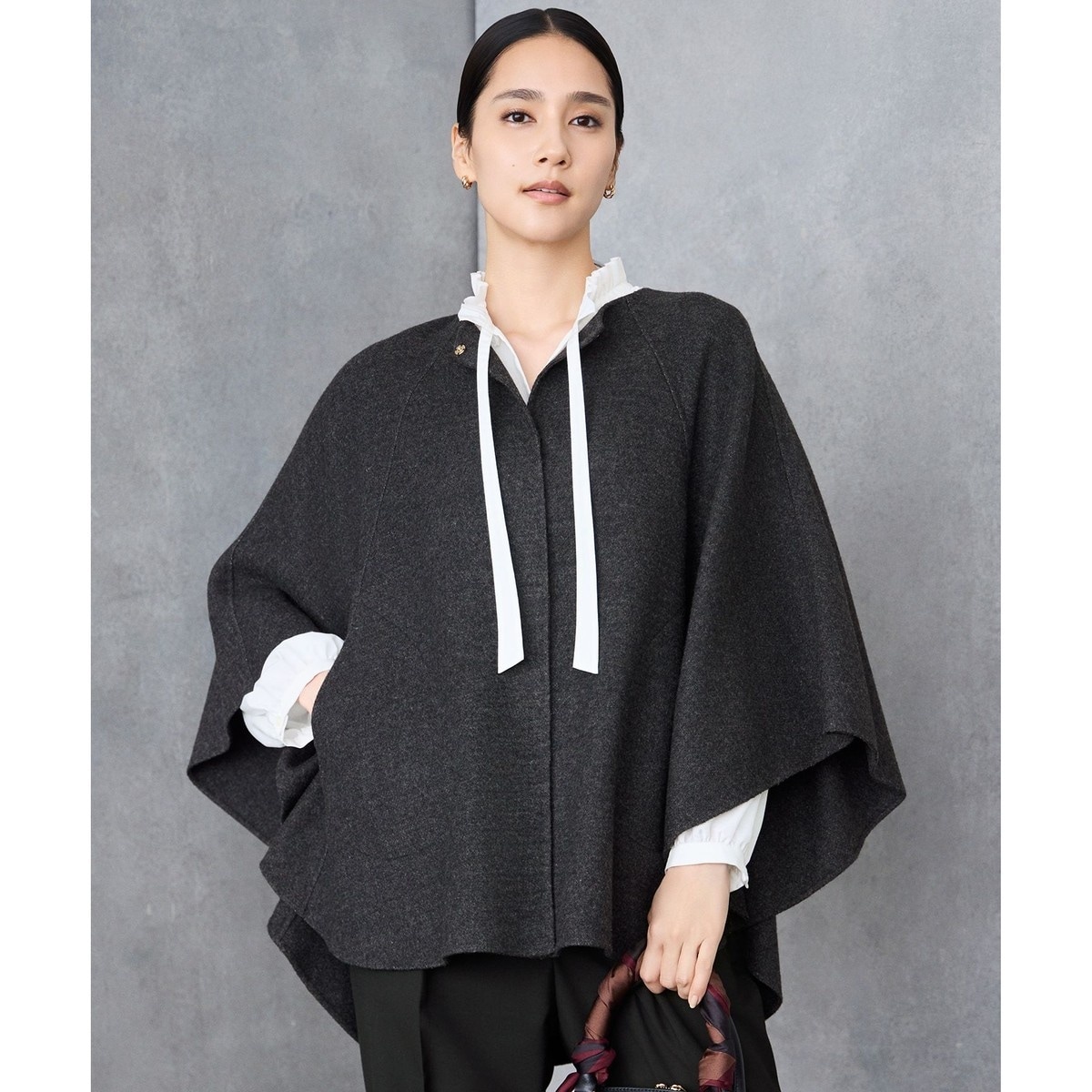 女性らしいデザインの上品なポンチョ■デザインさらりと羽織れる程よいボリューム感のポンチョです。ラグランスリーブのような斜めのハギを入れることで女性らしい印象です。ハギの切替えを利用したポケット付きです。前後差のあるデザインなので、スカートやパンツどちらにも合わせやすいアイテムです。フロントの開きは、ホックの仕様になっています。軽やかなリバー素材を用いて、リバー仕立てで上品に仕上げました。■素材16番カシミヤ混の原料を使用したリバーコート素材です。細い糸であることに加えカシミヤを入れることで軽く柔らかく、両面メルトン仕上げでツヤ感を出しました。TOPの糸の深みのある色合いが上質な素材です。