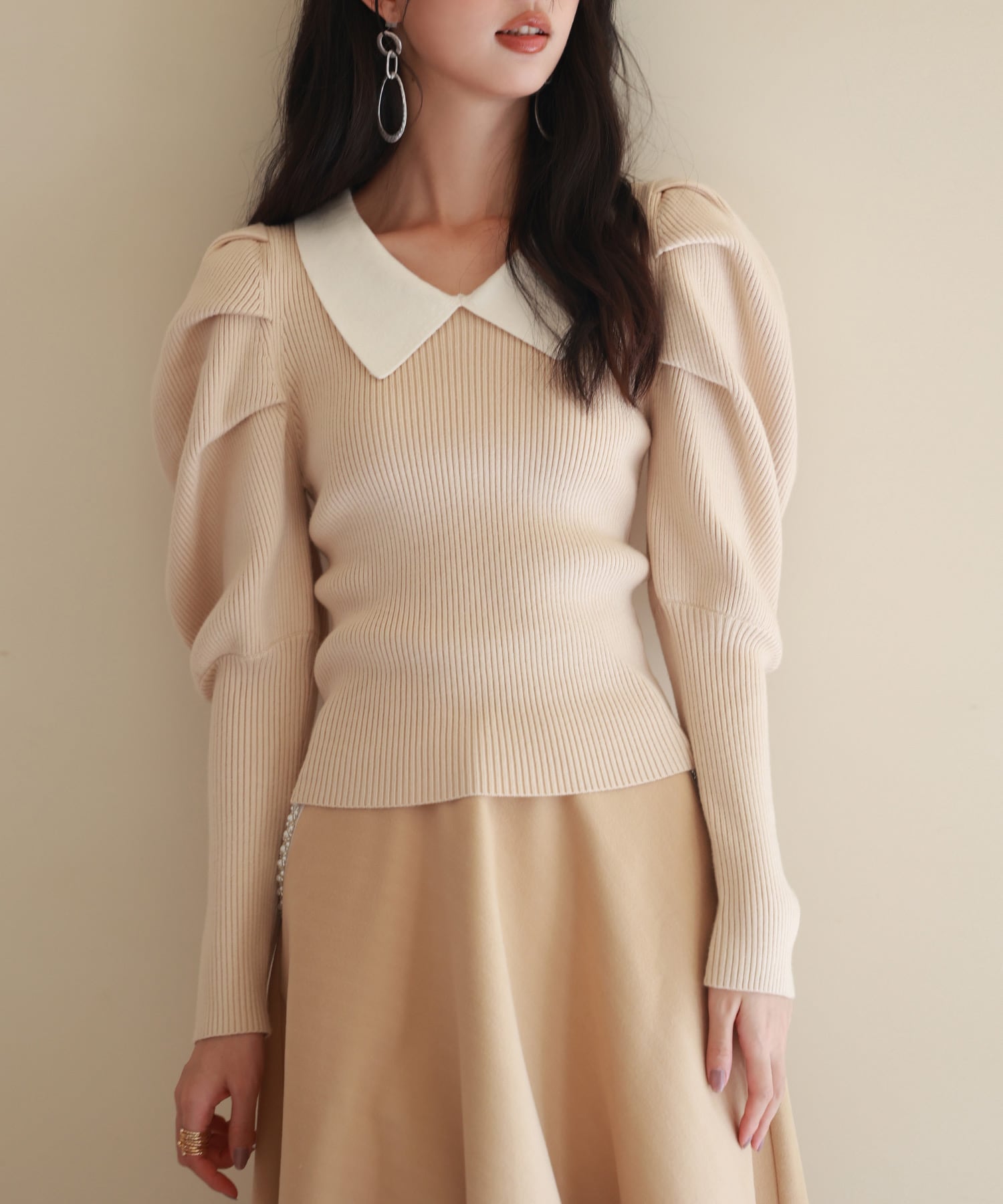 カラーニットとの配色が引き立つ襟付き。襟があることで女性らしい上品な印象を演出します。