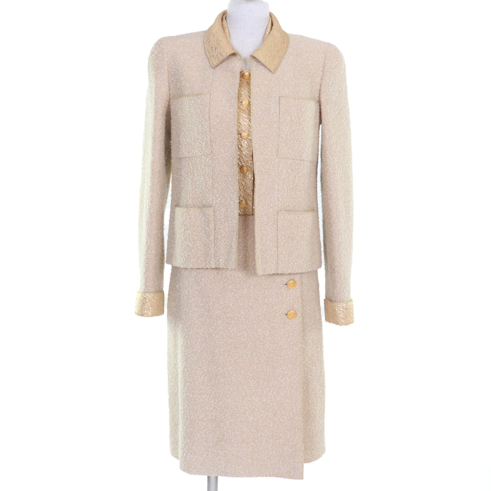 極美品★CHANEL BOUTIQUE シャネルブティック ヴィンテージ ウール100% 90年代 金ボタン付 ノーカラー フロントオープン ツイードジャケット+スカート スーツ ネイビー 36 フランス製 正規品 レディース【中古】
