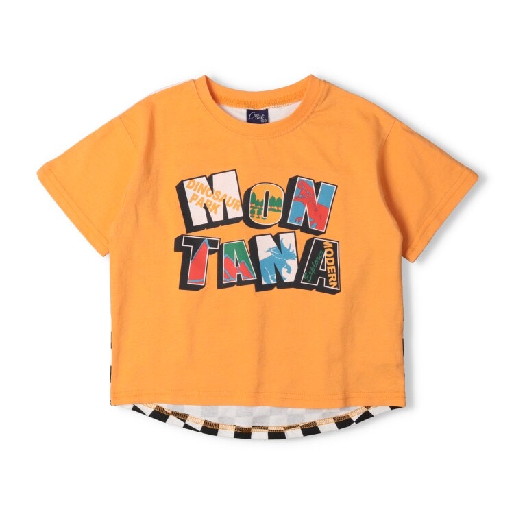 インパクトのあるロゴグラフィックプリント。大胆に切り替えたバックスタイルが目を引くデザインの半袖Tシャツ。これ1枚で今風ストリートコーデが完成。(ベビーサイズのみ肩ボタン仕様になります。)【アイテム】トップス カジュアル お洒落 オシャレ かっこいい かわいい 可愛い 普段着 デイリーウェア お出かけ着 お外着 お外遊び着 子ども服 こども服 男児 男の子 ボーイズ キッズ ベビーサイズ トドラーサイズ 幼稚園 保育園 小学校 通園 通学 小学生 2025年春夏物新作 丸高衣料 オレンジ ネイビー 紺色 チェック ストライプ