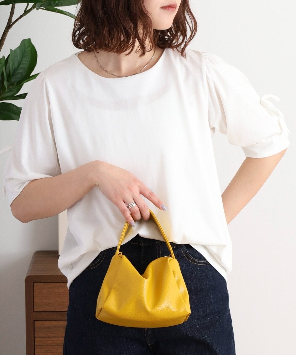 すっきりと開いたネックラインが顔まわりを明るく見せ、袖にあしらったリボンがさりげない可愛さをプラス。