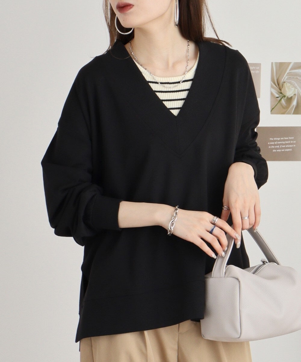 vネックの襟からカットソーやシアーブラウス、ノーカラーシャツなどチラ見えしたレイヤードスタイルが◎