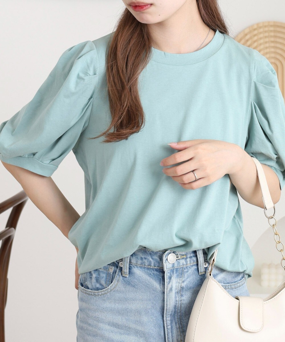 ふんわり袖で大人可愛い印象に仕上がる「ラウンドネックパフスリーブTシャツ」。
