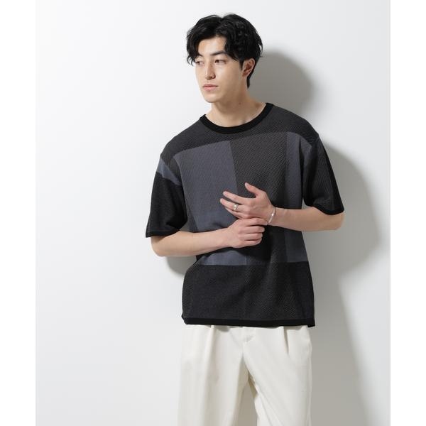 清涼感を感じる夏におすすめのサマーニットTシャツ。同系色でまとまったブロックチェックが上品な雰囲気の1着です。