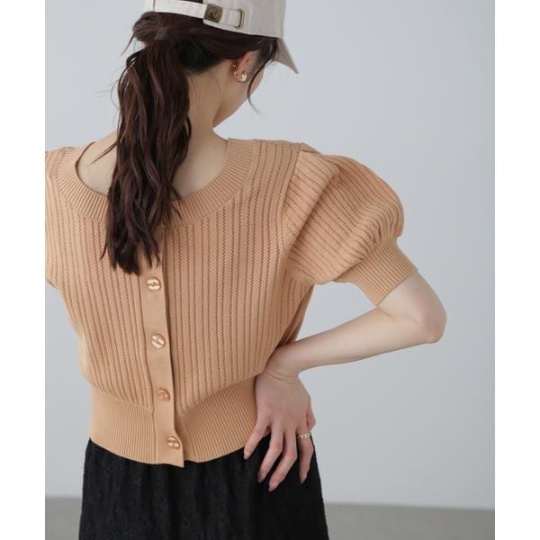 程よくざっくりとした編地でどんなボトムスにも合わせやすい半袖ニット。身頃と袖はふんわりとしたシルエットで、裾と袖口は編地変化でメリハリを叶えてくれます。すっきりとした丈感で、インでもアウトでも着こなせる便利なデザイン。前後2wayでカーディガンとしてもプルオーバーとしても着用できます。コンパクトなサイズ感なのでパンツでもスカートでも相性が良く、キャミワンピースの羽織りにもおすすめです。※モデルの着用画像の場合、光の当たり具合により、実際の色味と異なって見えることがございます。色味は、商品単体の画像をご参照ください。