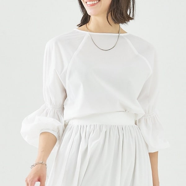 シャーリングを入れたボリューム袖がポイントのプルオーバー。ブラウスとしても着映えするON/OFF使えるトップスです。7分袖でですが、袖口のゴムで長さを調節出来るので短くすれば、パフスリーブに。春から夏まで長くお使いいただけます。