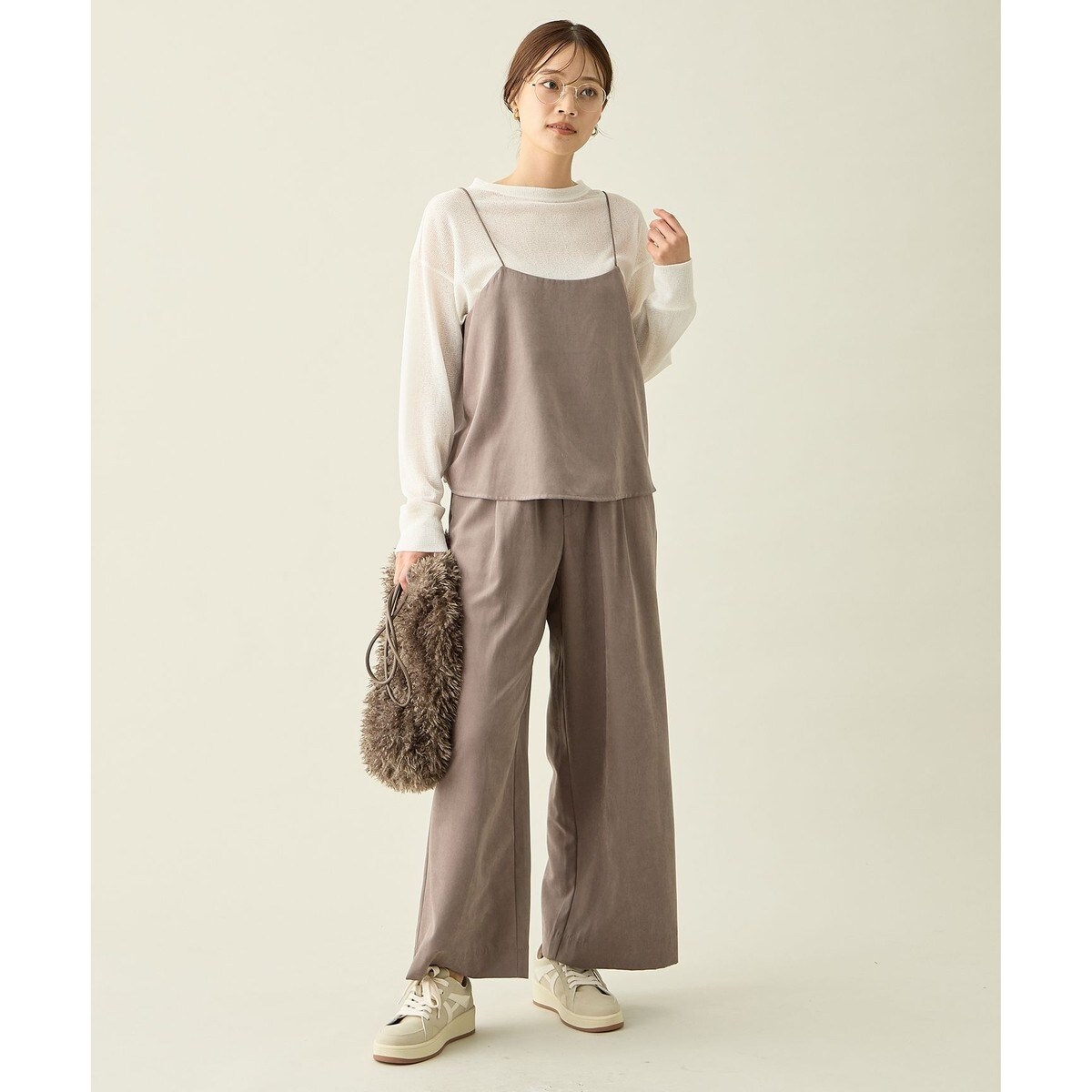 ・コンパクトなキャミビスチェとタックワイドパンツがセットになった着映えアイテム・セットアップではもちろん、単品でも着回しやすい万能デザイン・肩紐はリボン仕様で長さ調整可能、インナー次第で印象を変えられる・キャミビスチェは微フレアシルエットでキレイめな印象に・パンツは便利なポケット付き・初秋から春先までロングシーズン活躍