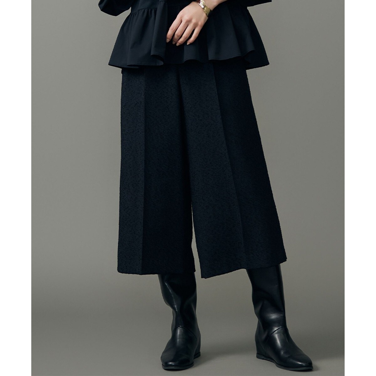 トレンドのスタイリングが簡単に完成するクロップドパンツ■デザイン2タックでセンタープレスの効いたストレートシルエットが特徴のクロップドパンツです。後ろウエストにはゴムが入っているのでストレスフリーな穿き心地です。いつものスタイリングに取り入れるだけで、トレンド感のあるスタイリングが完成します。■素材ループ状のリング糸の凹凸感がツイーディーな表情の素材です。ポリエステルの適度な落ち感とレーヨンリング糸の光沢が特徴で、大人でも着やすく幅広いシーンで活躍します。■同素材アイテムジャケット(JKWRCW0406)ジレ(VRWRLS0406)ジャンパースカート(OPWRLS0406)クロップドパンツ(PRWRCW0406)ストレートスカート(SKWRCW0406)