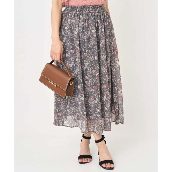 小さめのドットや繊細なリーフフラワーが散りばめられたプリントのシフォンスカート。多色使いですが、大人っぽい色合いでシックに着こなせます。落ち感がある素材は広がりすぎないので甘くなりすぎず、ウエストゴムでストレスフリーな着心地も嬉しい。