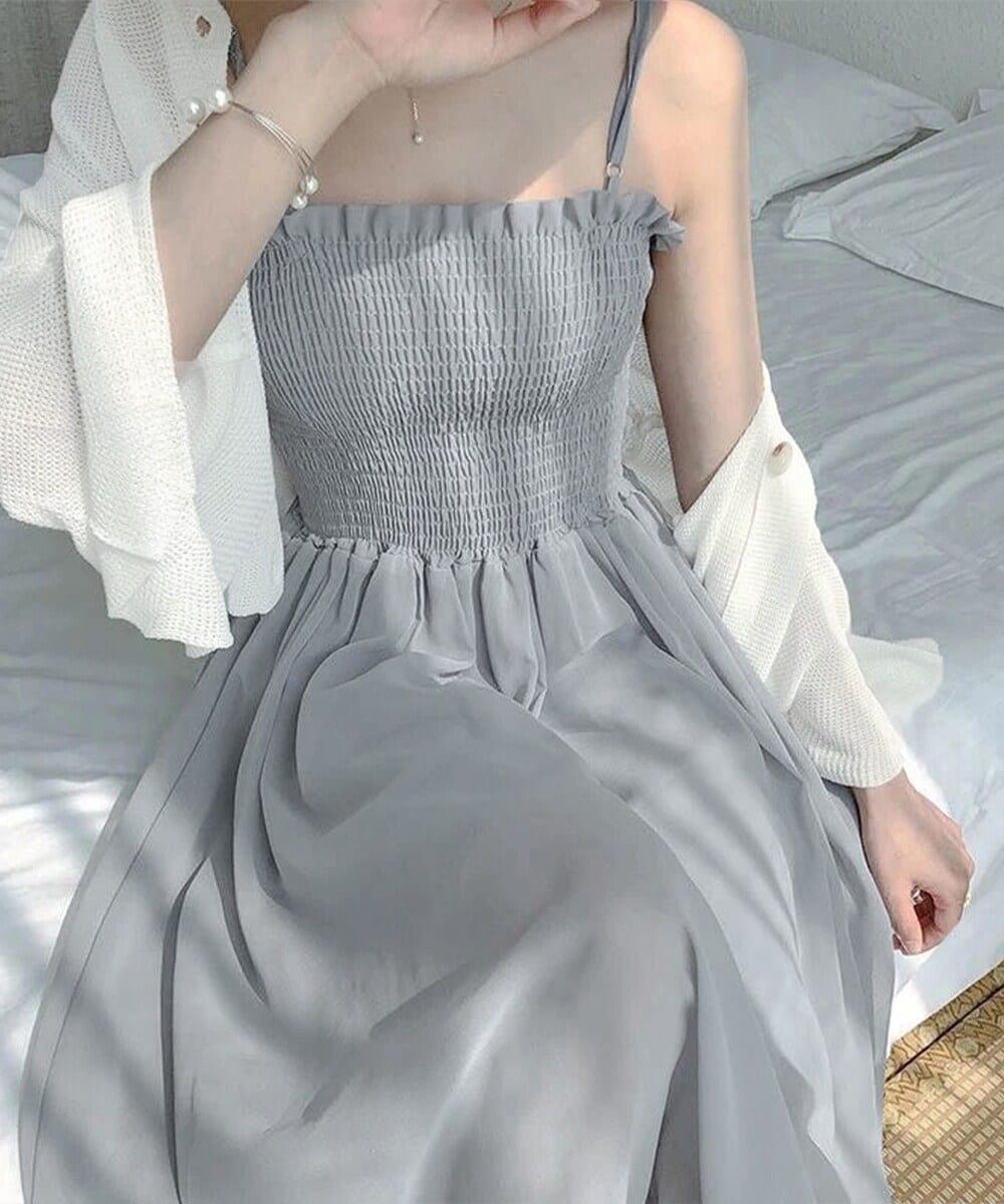 リゾート感たっぷりのキャミワンピースとシアーニットカーディガンのセットアップ。