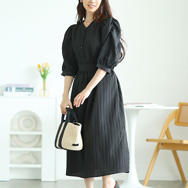 洗練されたバックコンシャス、後ろ姿から魅せるパワショルワンピースです。デコルテを美しく見せる浅めのVネックに、袖先までラインを整えるパワーショルダー。後ろ姿にはやわらかく結ばれたビッグリボンと深めのV開きがアクセントになり、甘さを控えたモードなムードで印象美人を演出します。ウエストは後ろゴム仕様で着心地にゆとりを持たせ、広がりすぎない絶妙なフレアが縦ラインを引き立てスタイルアップ。ウエスト位置を高めに設計しているため、自然に脚長効果を発揮。二の腕を包み込む五分袖や視線を上に集めるバックリボンで、視覚的にボリュームを軽減してバランスを整えてくれます。肩のラインやウエストに程よくメリハリをもたせることで、気になる体型をナチュラルに包み込むデザインです。背中にリボンをしのばせた、ちょっぴり気の利いた大人の一枚。そんな想いに応えてくれる一着です。