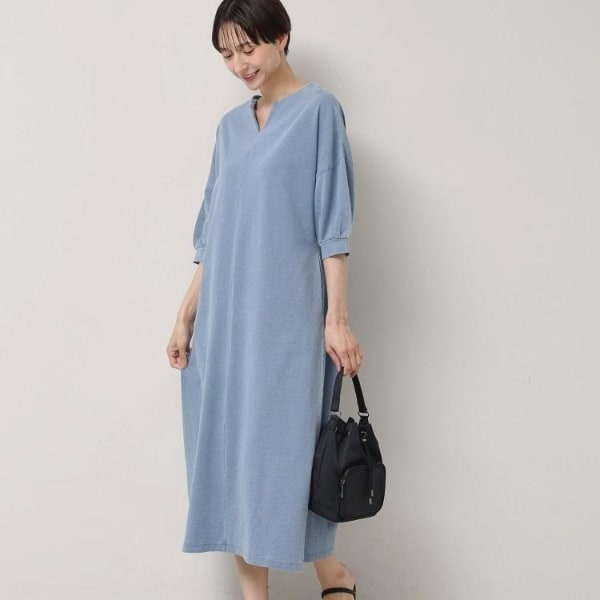 ゆったりとした身幅ですが、キーネックと、キュっとしまった袖口デザイン、裾のスリット等により、すっきり見えするワンピースです。