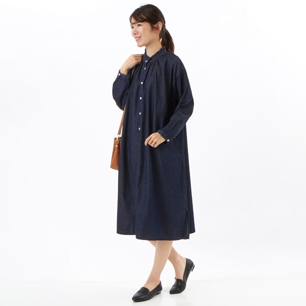羽織でも使えるツイル無地・インディゴ無地前開きワンピース。