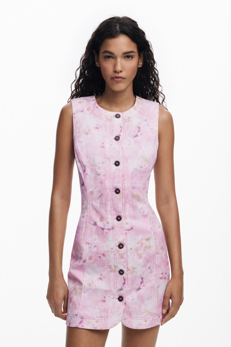 前面にボタンが付いたノースリーブのショートドレス、無地でボートネックのデザイン。