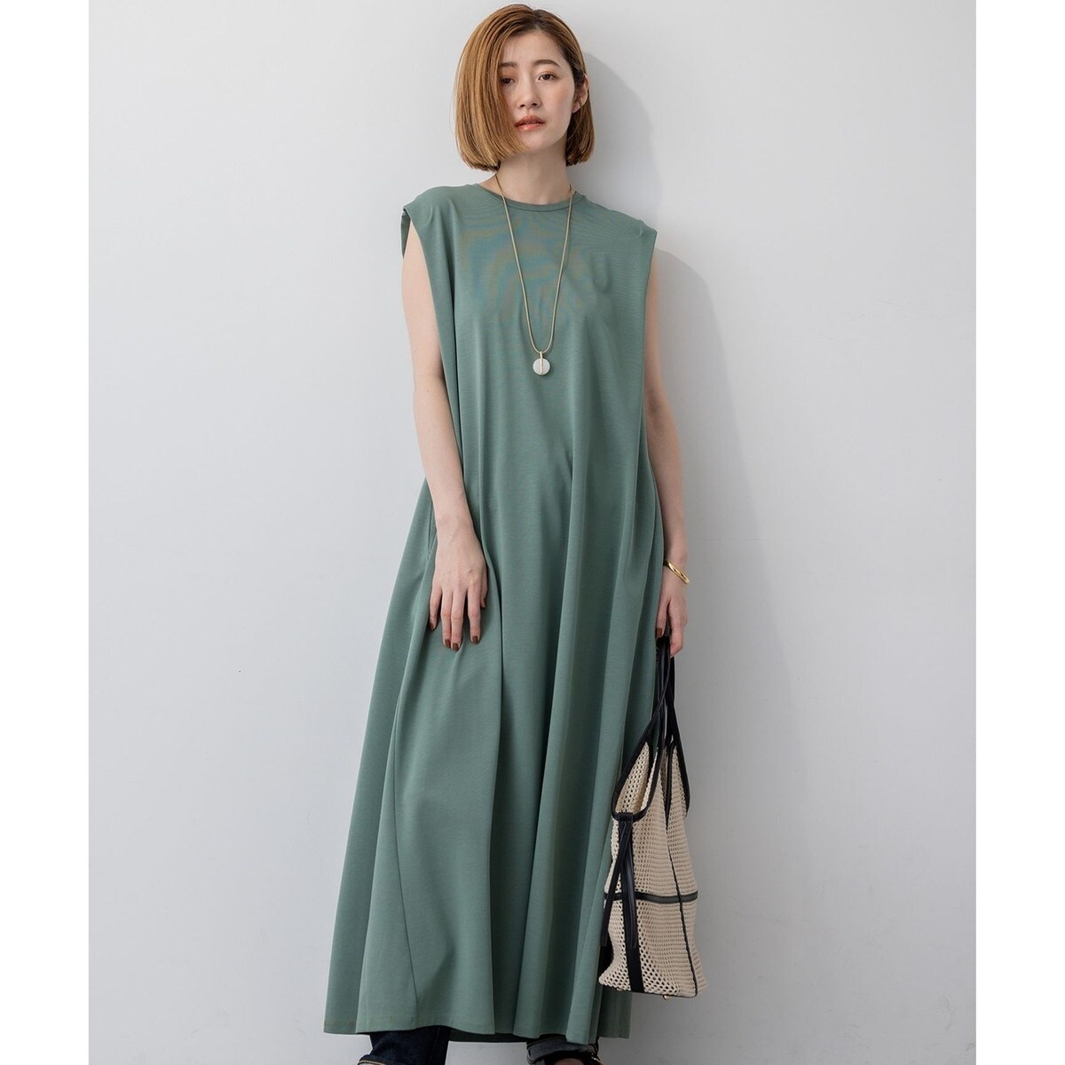 クルーネックでシンプルにこなしたスリーブレスワンピース。肩口に入れた深めのタックディテールで腕のラインが程よく覆われ細見えするデザイン。またスカート部分のサイドにマチを入れることで、立体的に広がるフレアシルエットながら、すっきりとした印象のロング丈に仕上げています。カラーは、爽やかな青味のあるモスグリーン(#053)、暑い時期にもカジュアルすぎず適度な品を感じるブラウン(#030)、洗練された印象の深みのあるグレー(#004)、シックな雰囲気が漂うブラック(#005)の2色展開です。