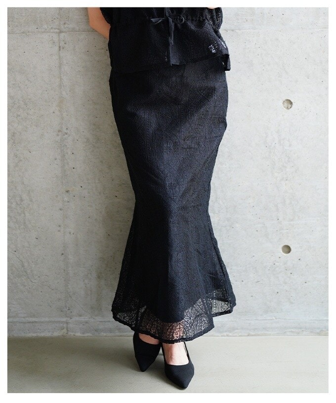 繊細なレース生地をふんだんに使用したスカートは、リッチな大人の綺麗めスタイリングにぴったりな一枚。細やかなレース刺繍が全面にあしらわれ上品さを纏う贅沢さが存在感を放ち、穿くだけで高見えスタイリングを叶えます。ウエストゴムを採用し、エレガントな着こなしながらもリラクシーな穿き心地でストレスフリーに。立体裁断の切り替えでマーメイドライクなシルエットを演出し、すっきりとした女性らしいラインを引き出します。さらりと滑らかな裏地付きで肌の通りも良く、脚さばきも快適に。足下の透け感で軽やかな印象を纏い、ロング丈ながらも重たくならず涼しげに。綺麗めには勿論のこと、カジュアルなトップスとMIXしてもサマ見えします。同素材のブラウスと合わせればセットアップ風な着こなしを楽しめます。