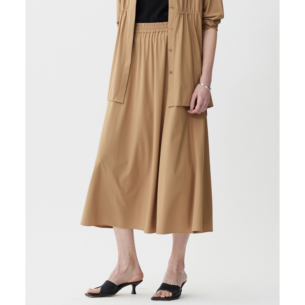 ■デザインウエストゴムのギャザーフレアスカートです。ウエストの内側にドロストコードつきで好みのサイズ感に調整が可能です。脇ポケット付きなのも嬉しいポイント。単品はもちろん、同シリーズのトップスと合わせてセットアップでの着用もおすすめ。旅行や出張などアクティブなシーンで活躍間違いなしの1枚です。
