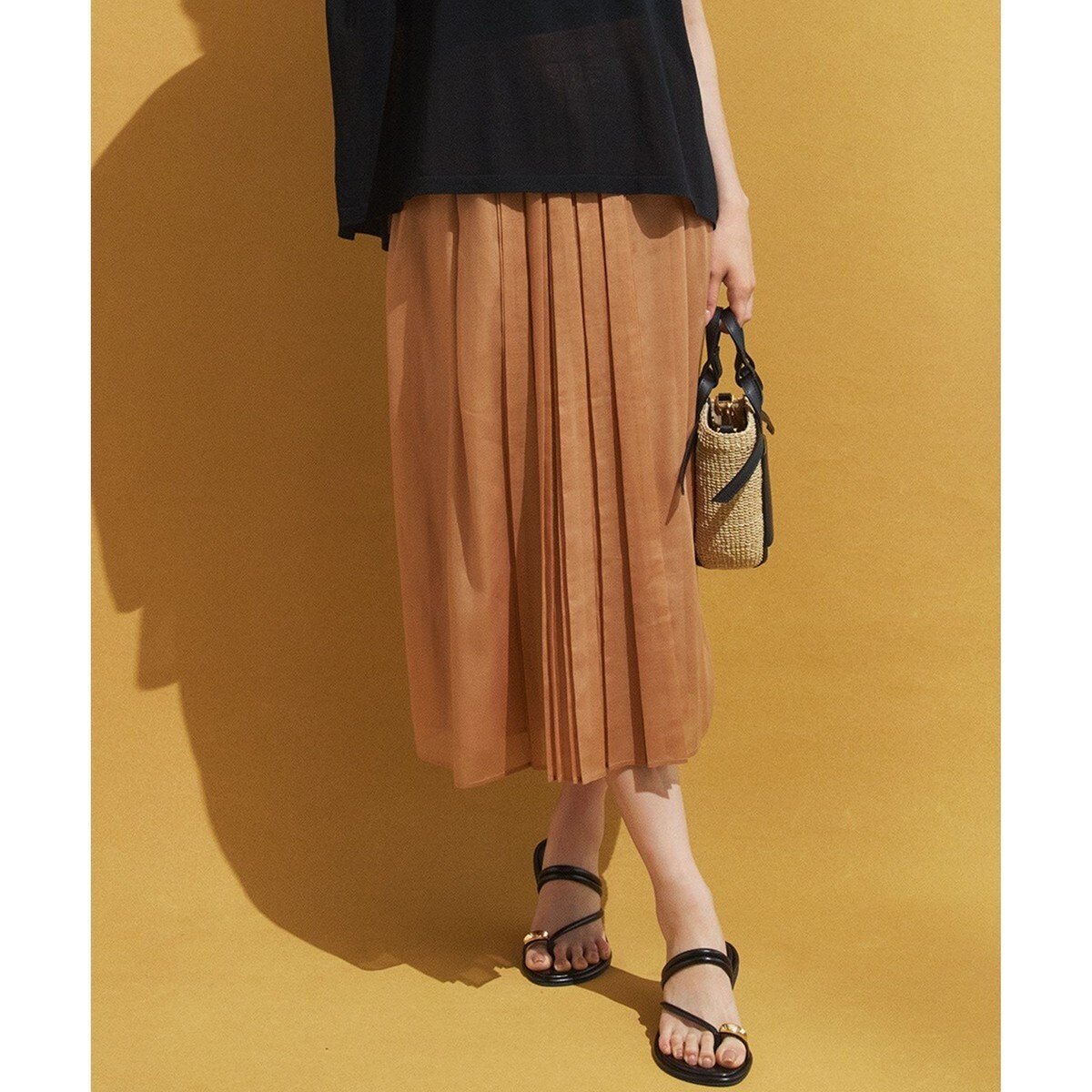 フロント部分に重なったプリーツを入れたタックスカート。贅沢な分量感と、フロントのデザインがポイントです。生地をたっぷりと使用していますがタックデザインで広がりすぎずに、スッキリと着ていただけます。カラーは、キャッチ―なライトオレンジ(#022)、上品な印象のベージュ(#033)、トレンド感のあるダークグリーン(#065)、こなれ感のあるダークブラウン(#035)の4色展開です。