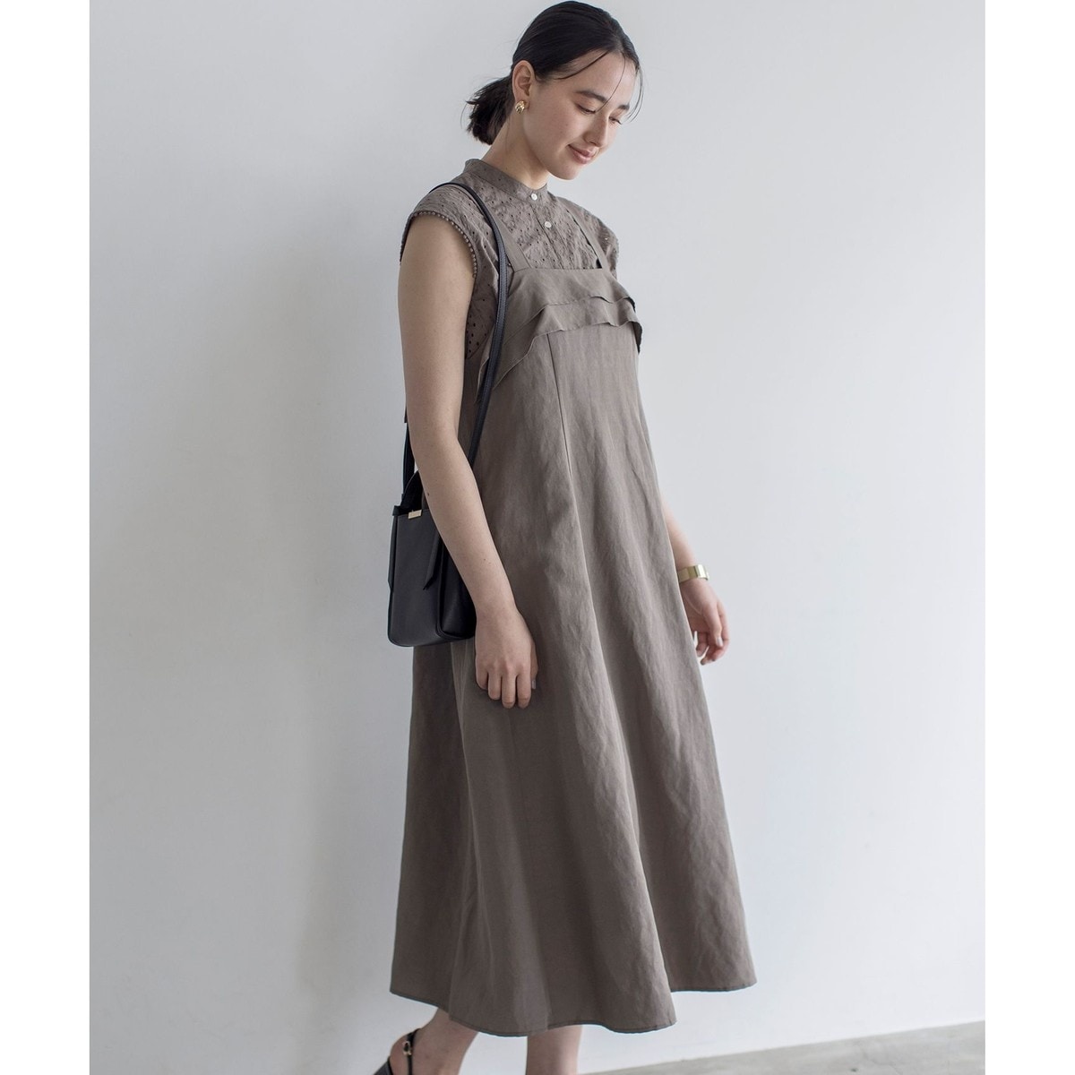 ■デザイン・身頃は裾に向かって広がるフレアーシルエットでゆったりと心地よく着用頂けます。・華奢過ぎない太めのストラップは後の金具で長さを調節可能。・ファスナー無しのストレスフリーながら後中心部分にゴムを使用し、程よいフィット感があります。