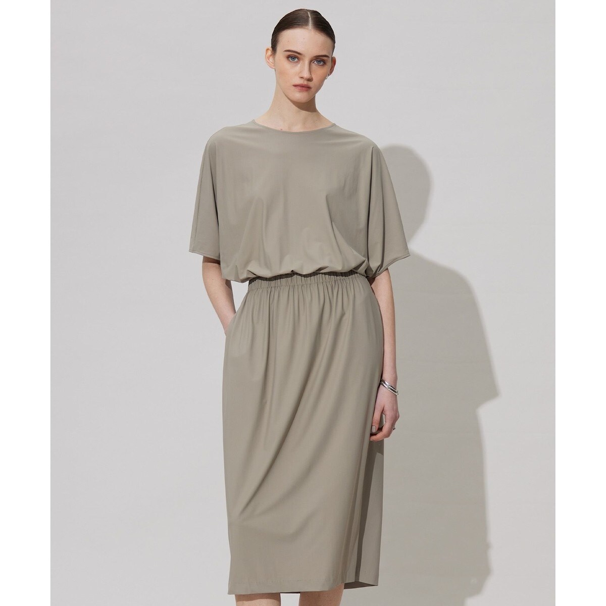 ■素材生地の肉感は薄く、軽やかさが特徴のスキューバ組織のジャージー素材です。素肌に心地よい滑らかな肌触りと、適度なストレッチ性、美しいドレープ性のある素材です。生地を薄くし、より冷感性のある素材にアップデートしています。