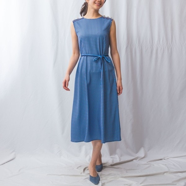 幾何柄×ボーダーMIXのスカーフ風プリントで仕立てられたワンピース。肩の部分のボーダー使いとゴールド釦でマリン風なイメージに。ボーダーと同柄の細リボンが付属しており、ウエストマークすることで愛らしくメリハリ感をプラスしてくれます。軽くて柔らかなストレッチ素材を使用しており着心地が良いのも魅力。1枚でも着こなしが決まり、ジャケットと合わせたコーディネートもおすすめです。