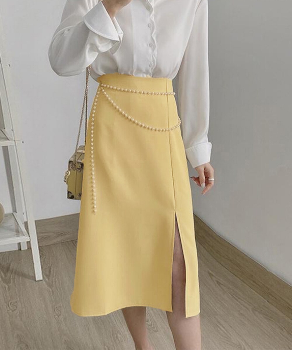 シンプルデザインに三連パールチェーンを加えた華やかなAラインバックファスナータイトスカート
