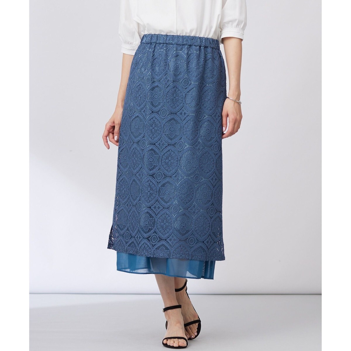 ■デザイントレンド感のあるジャカードレースのスカート。ウェストがゴムの仕様なので楽ちんな着用感も魅力な1枚です。形はシンプルで着回し力の高いナローシルエット。伸縮性があるので穿きやすく、日常使いしやすい動きやすさにもこだわりました。裾には別布を入れて今年らしいデザインにしています。立体的な柄の表面感のレースには、シンプルなTシャツを合わせるのがおすすめです。