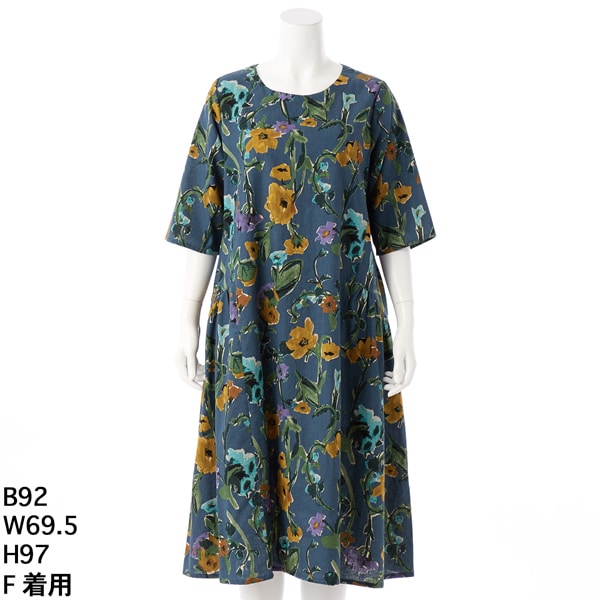 着物リメイク ロング ワンピース|洗える化繊素材&帯ベルト 澄み渡る天色~瑠璃の地に、四季花が枝垂れて咲きこぼれます。 KW-1085