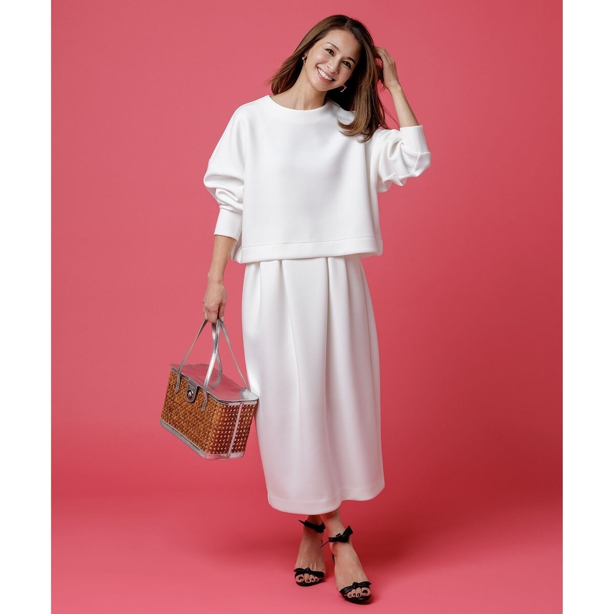 ■デザインウエストタックにより立体感を出した絶妙なコクーンシルエットが鮮度のあるスカート。ウエスト部分はゴム入りで、さらに後ろ中心にはスリットを入れ、着心地も足さばきもよいデザインに仕上げています。同素材のクロップドトップスとのセットアップスタイルもおすすめです。※ホワイト(001)のみストレッチ裏地付き