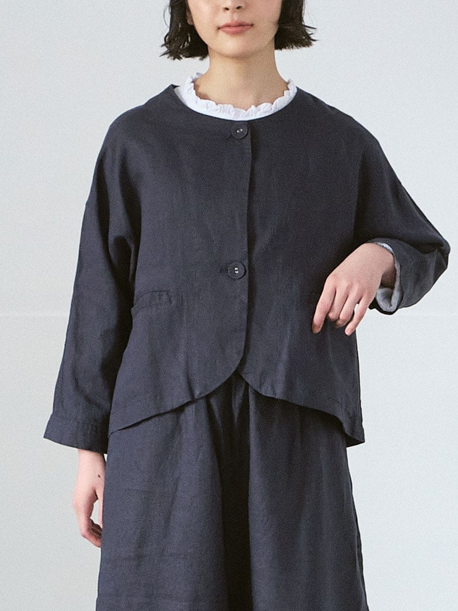 すっきりとした印象をあたえてくれるノーカラータイプで洗練さもプラス。