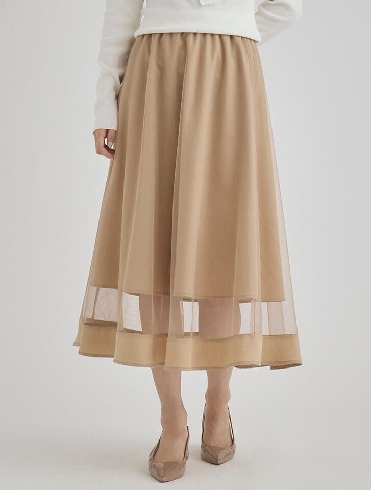シアーなチュールを重ねたデザインが印象的なミディ丈スカート。ほどよい透け感と、裾に向かってふんわりと広がるシルエットが女性らしさを演出します。ウエストはゴム仕様になっているので、ストレスフリーな穿き心地も嬉しいポイントです。