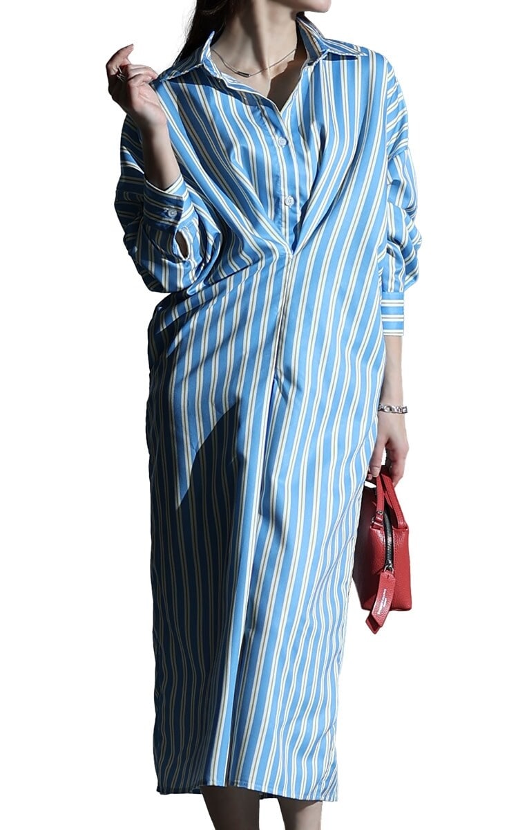 爽やかなブルーカラーが軽快さを演出するシャツワンピースは、ひとくせのスパイスが効いた垢抜ける一枚。大胆なタックデザインで、ウエスト周りを程よくシェイプし、スタイリッシュにメリハリある印象に。タックの変形デザインがエッジを重ねながら、着るだけでこなれるスタイリングが叶います。レギュラーカラーできちんと感を演出し、ドロップショルダーでバスト周りや二の腕もゆったり。コンパクトながらも、しっかりと裾幅もあるから足さばきも快適に。ミモレ丈で足下もすっきりさせ、清涼感のあるブルーが爽やかさを昇華させてくれるワンピースは、オンにもオフにもマッチする大人な一枚。