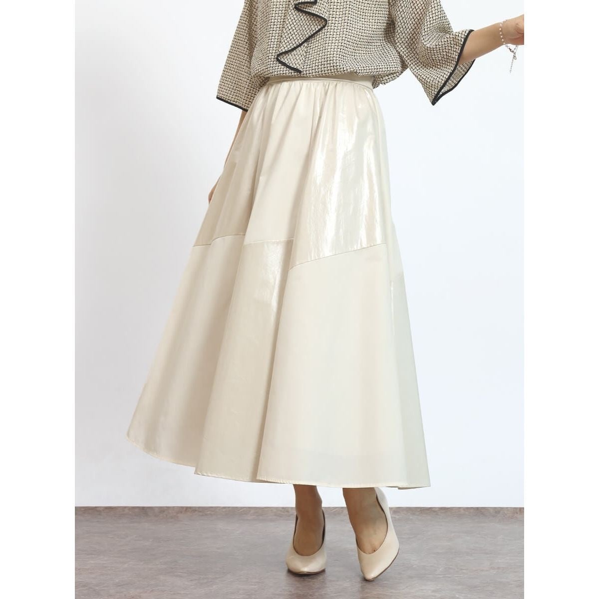 2種類の素材を巧みに切り替えたフレアスカート。