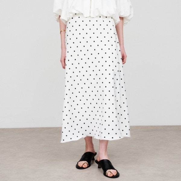 ・シンプルなフレアシルエットが美しく、軽やかさをプラスしてくれるサテンスカート。