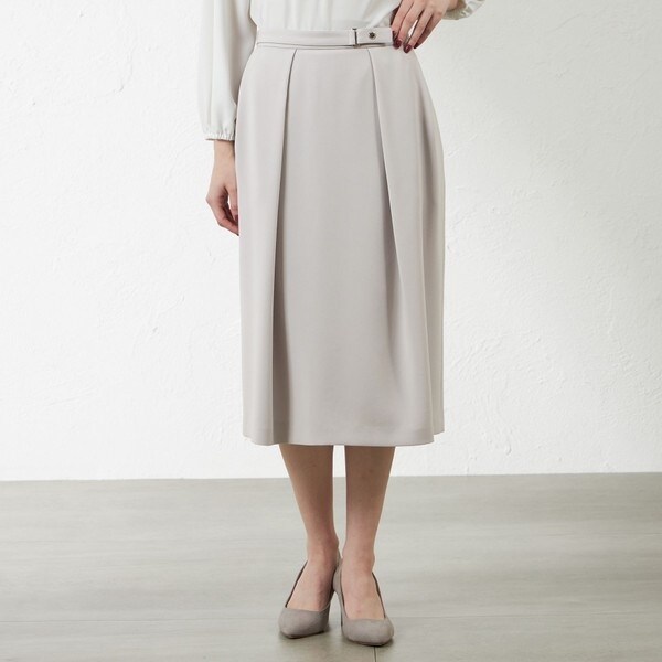 タック分量を調整しスッキリ見えに拘った、Aラインシルエットのスカートです。共ベルトにはAMACAロゴ入りドット釦を施しており、品よく着映えるデザインに仕上がっております。バックセンターのみゴム入りで、きれいめながらリラックスした着心地です。