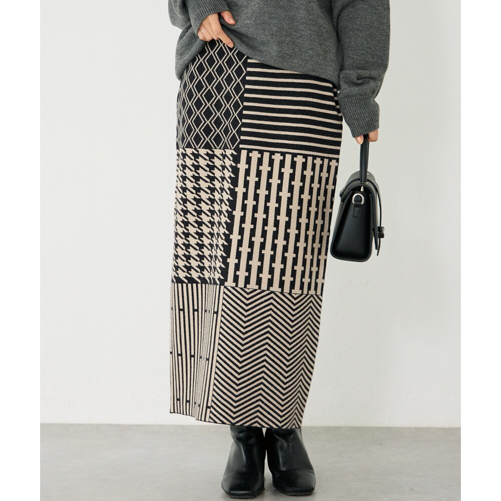 千鳥柄やボーダーなど複数の柄を組み合わせたタイトスカート。