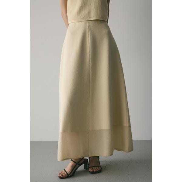 モデル身長165cm(Mサイズ着用)両あぜ編みで立体的でふくらみのある編地に仕上げたニットスカート。糸にやや光沢もあるので上品なつや感が出つつ、ドライな質感でモードな印象に仕上げた一枚です。太めのウエストから裾に広がるフレアシルエットがスタイルアップに導きます。裾部分はやや透けたデザインで足元を軽やかに見せてくれます。ウエストはゴム仕様。500HAT70-0481(セットアップショートニットタンク)とセットアップ着用可能。ストレッチあり、透け感なし。【お手入れ方法】手洗い可