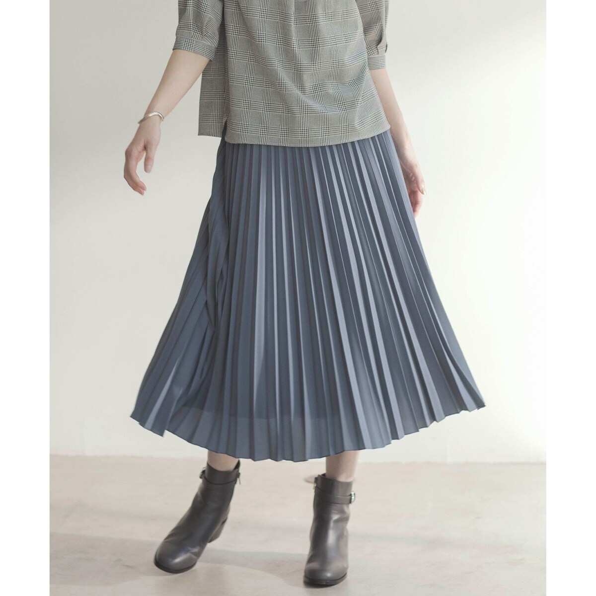 フェミニンなフレアーシルエットのプリーツスカート。ロング丈ですが、動くたびプリーツが揺れて軽やかな印象に。着脱はウエストのサイドファスナーになっており、後ろウエスト部分はゴム仕様にして伸縮性を持たせています。落ち着きのあるカラーが秋を感じさせるアクセントになる、きれいめなスタイリングには欠かせないアイテムです。総裏ありのため、下着が透ける心配もなく安心して着用いただけます。カラーは、肌なじみが良く柔らかな印象のモカ(#030)、爽やかで洒落感のあるブルーグレー(#074)の2色展開です。