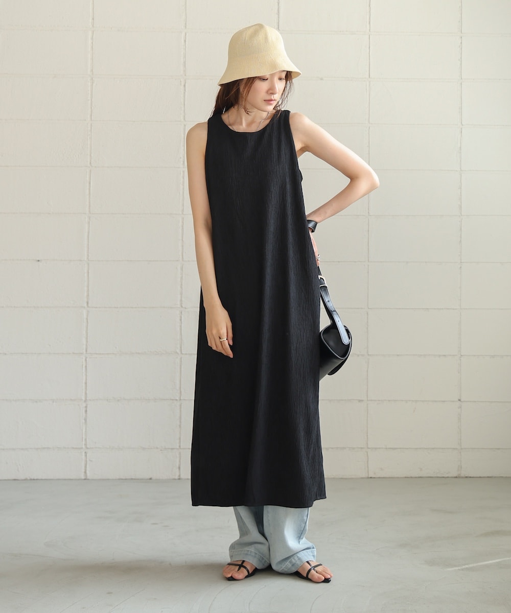ヘルシーで女性らしい印象のアメスリワンピースを上品な楊柳生地で仕上げました。フロントは飽きの来ないシンプルさがありながら、バックスタイルはネックからスッと通ったタックですっきりと魅せます。背中の大胆かつ洗練されたスリットも視線を集め、真夏の着こなしにアクセントをプラス。皴になりづらくすとんとした生地感で 動くたびに美しいドレープが際立ちます。