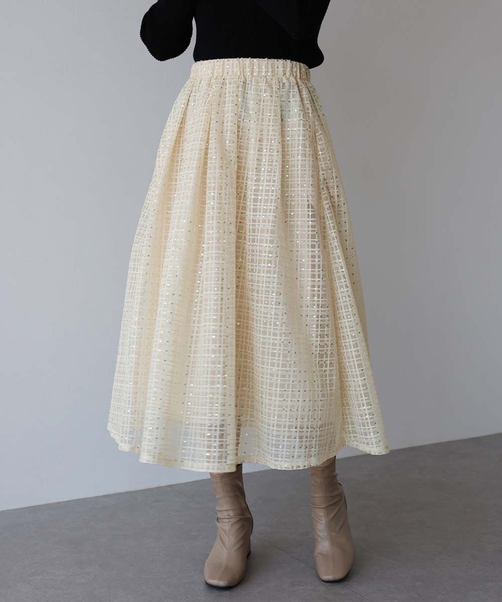 ツイードのようなチェック柄が目を惹くギャザーフレアースカート