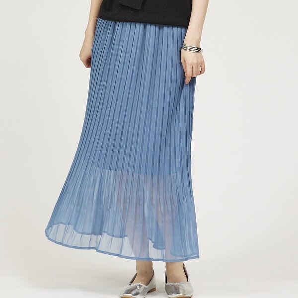 シンプルなプリーツスカートですが、裾にかけて消えていくプリーツがランダムな動きを演出してくれます。ウエストは内側に共紐が付いているのでサイズ調整可能。裾の裏地を少し短めに設定しているので女性らしい透け感を楽しめます。