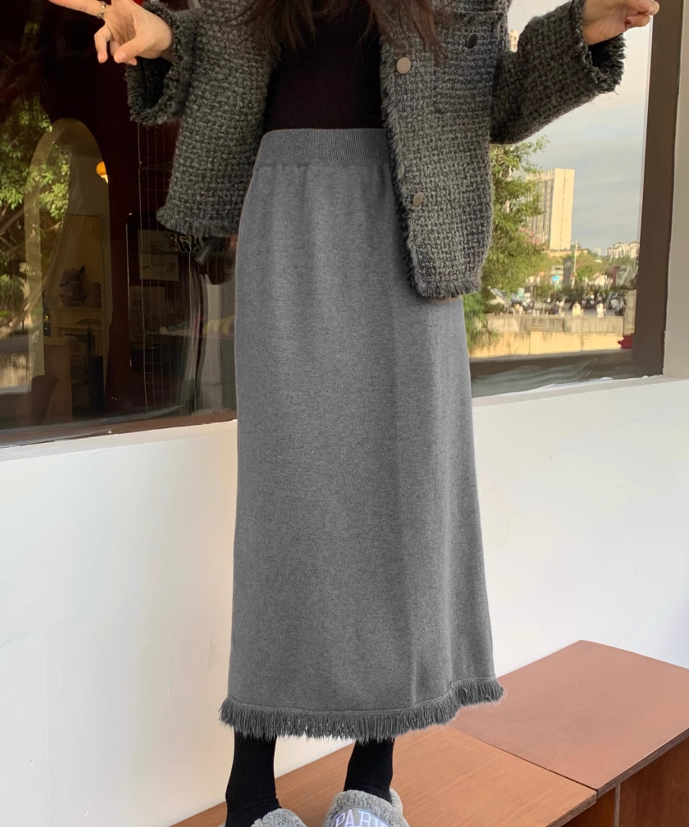 体のラインを拾いすぎないセミタイトが女性らしい着こなしを演出する裾フリンジニットスカート