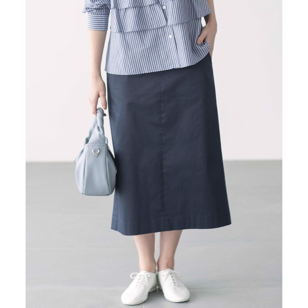 ■デザインすとんと落ちるIラインシルエットと長めレングスが女性らしいスカートは、コンパクトなトップスはもちろんリラクシーなシルエットのトップスとの相性も抜群。ストレッチがきいた素材で、後ろスリット入りなので、タイトデザインでも足さばきも良いデザイン。ハイウエストで美しく腰まわりにすいつくようなシルエットをつくり、甘さはありながらもすっきりとしたクールな印象に仕上げています。後ろウェストはゴム仕様にしているので着心地の良さも嬉しいポイントです。スタイリングを選ばない汎用性の高いアイテムは通勤シーンやお出かけシーンに大活躍間違いなしです。