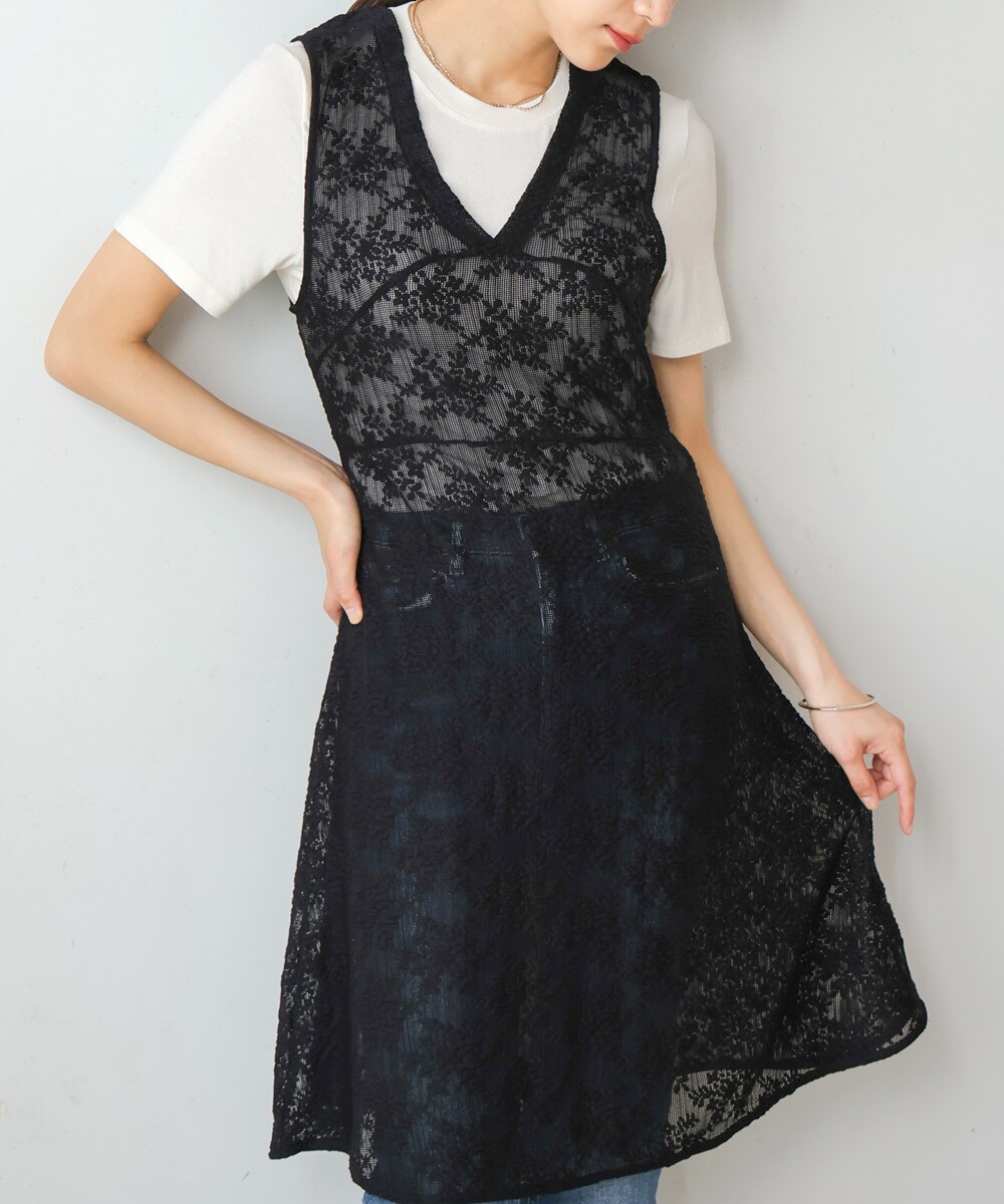 伸縮のあるソフトなレースでエレガントな雰囲気です。ハイウエスト切替でスタイルアップも期待でき、深いVネックはデコルテ周りをシャープに魅せます。低身長の方でもバランスよくお召し頂けるくらいの短めのレングスです。
