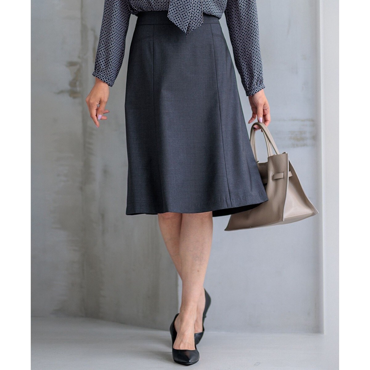 23区定番の美しいフレアシルエットのスカート。ゆとりがあるので、脚のラインを拾い過ぎず誰でも着こなせる一枚。同素材のジャケットと素敵に合わせていただけます。短すぎず座った時にも綺麗な見え感がポイントです。カラーはベーシックな無地のブラック(#005)、上品な印象のネイビーストライプ(#175)、細かい柄でシーンを問わないグレーミニチェック(#304)に、新たに洗練された印象のグレー(#004)を追加した4色展開です